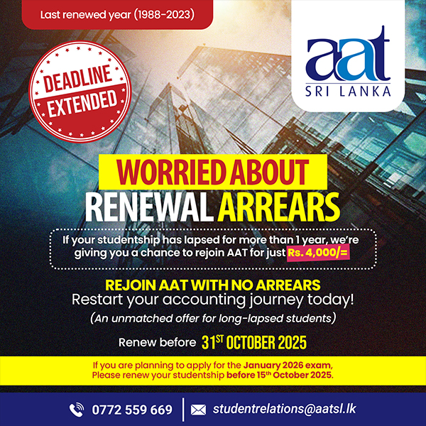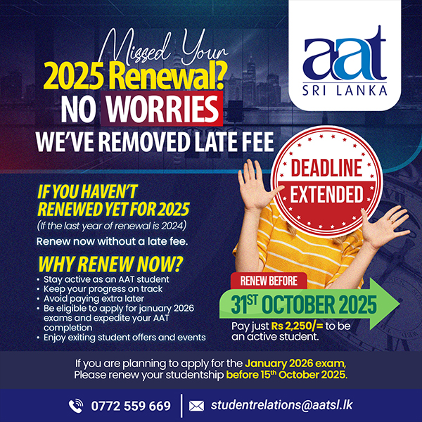 By renewing now under these special offers, you can sit for upcoming AAT exams, stay on track for timely qualification, access seminars, events & study support, gain recognition by employers as an active student, use the AAT Job Bank, and access exemptions, a pathway that recognizes your previous studies (A/L, Degree, HND, or professional qualifications) and reduces the number of subjects or levels you need to complete, helping you qualify sooner. If you want to know more about exemptions (subject release), Please follow : Exemptions, Exemption FAQ