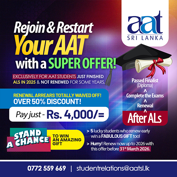 Please note due to recent challenges, (floods/landslides, caused by Cyclone Ditwah and related disaster conditions) and disruptions to A/L exams, this special offer has been introduced to give you more time to continue your AAT journey without interruption.